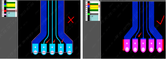 (2)焊接手指板内焊盘上的过孔不能加成一排,防止应力集中在过孔上,容易导致断裂