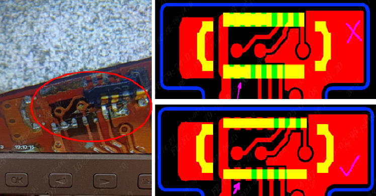 (7)因FPC是使用的阻焊膜不能像绿油一样做阻焊桥,在设计IC类焊盘时,焊盘上不能有多余的覆铜(如下图圈住的焊盘设计不合理),否则会导致焊盘变大,间距变小,焊接时容易短路。