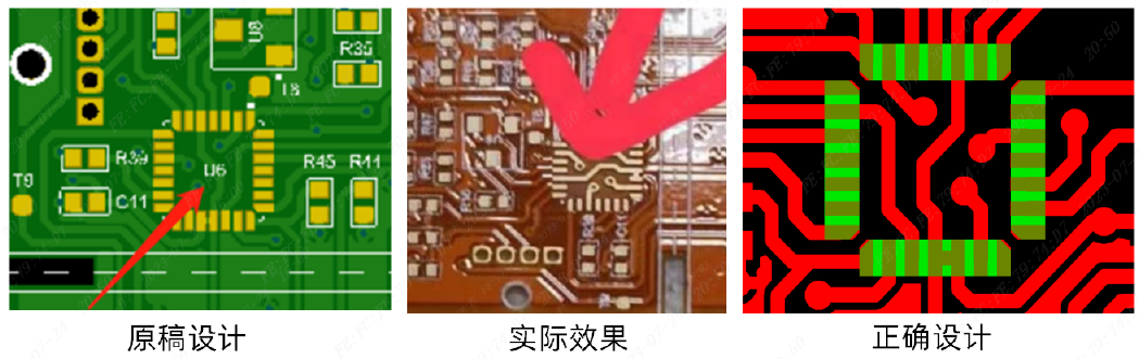 (2)IC中间需要有桥连才能保留中间的阻焊