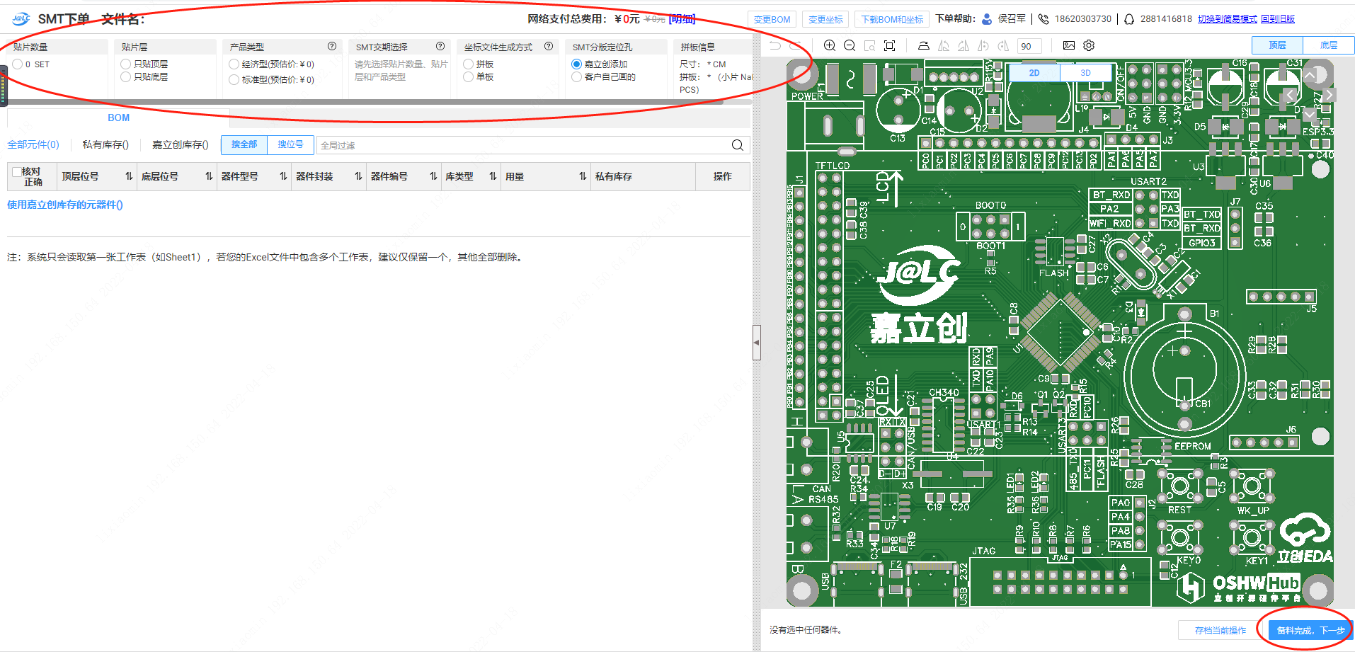 2.选此方式下单,点击“下一步BOM匹配”后,会进入BOM匹配界面,您选择您需要修改的器件修改即可,后按流程操作即可成功下SMT订单,此时SMT为新单。