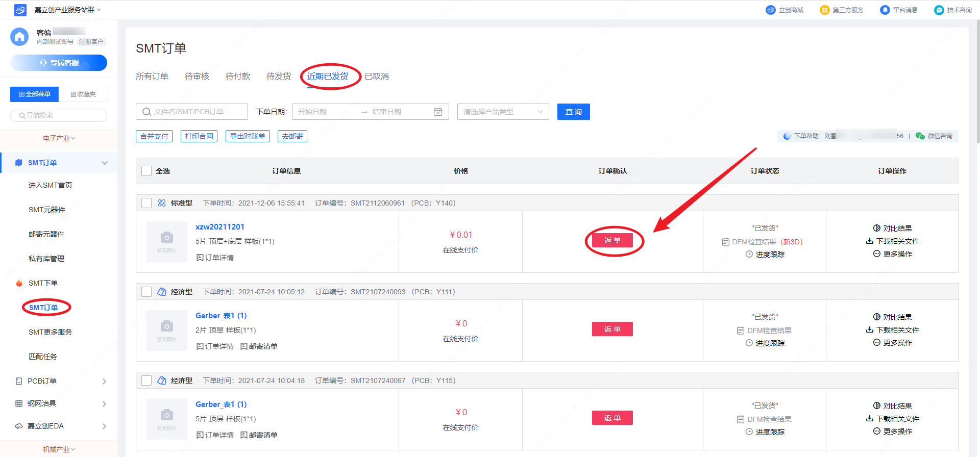 在【SMT订单】—【SMT订单】—“近期已发货” 的菜单内找到需要重新投产的订单,点击【返单】按钮即可。