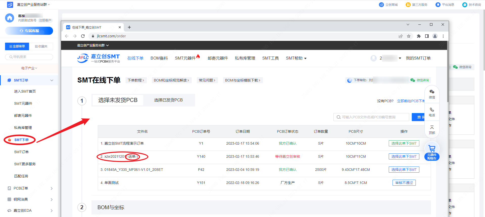 第三步:在PCB提交订单后,在【SMT订单】—【SMT下单】的菜单内会体现出来需要返单的SMT订单,如图所示在文件名后面会带有“返单”字样。