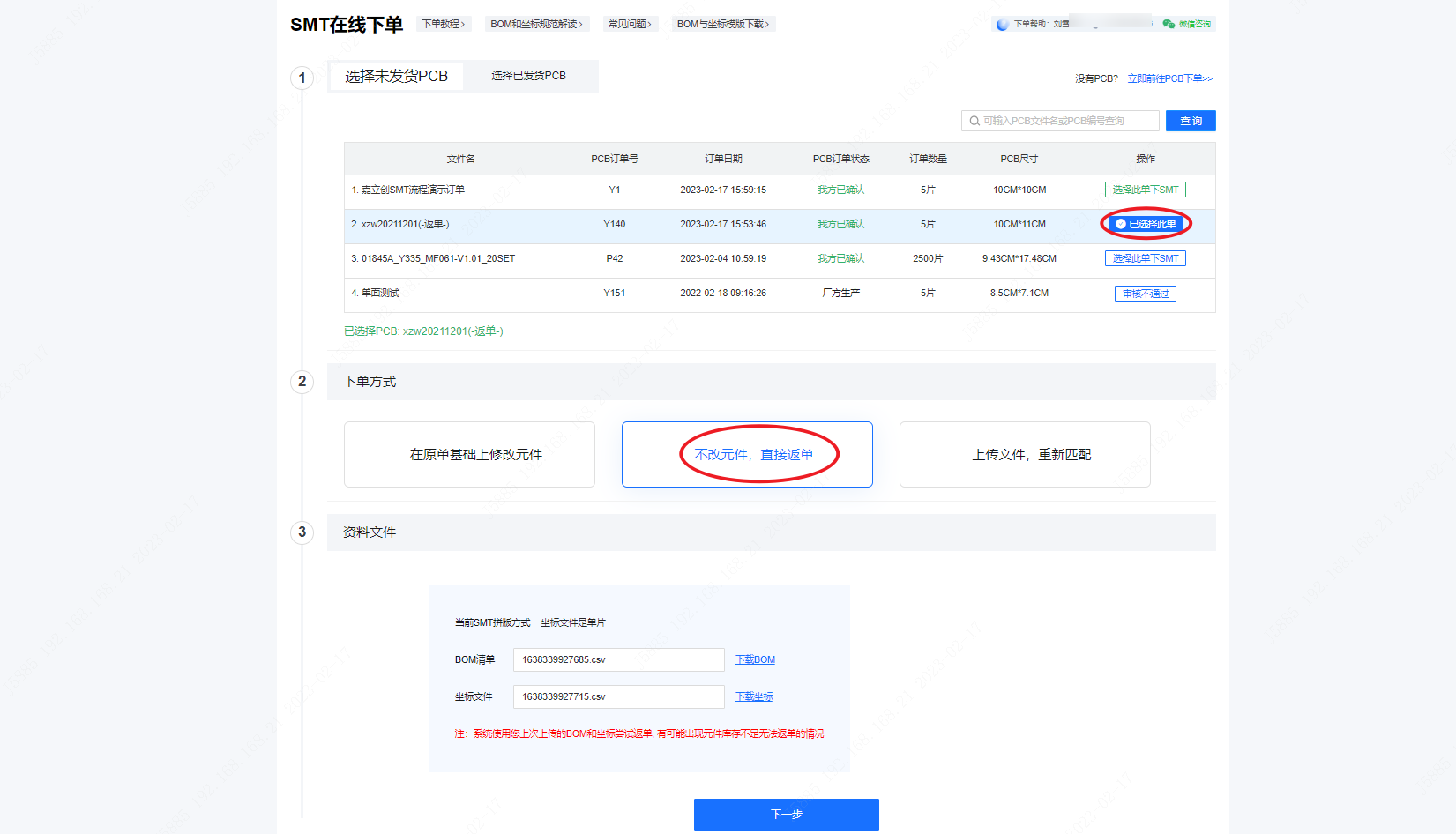 第四步:而后点击【选择此单下SMT】按钮后会出现上下标题为“下单方式”、“资料文件”的页面框。您可以在框上方的【下单方式】,选择您需要的下单方式(三种:“在原单基础上修改元件”/“不改元件,直接返单”/“上传文件,重新匹配”)后点击下一步。