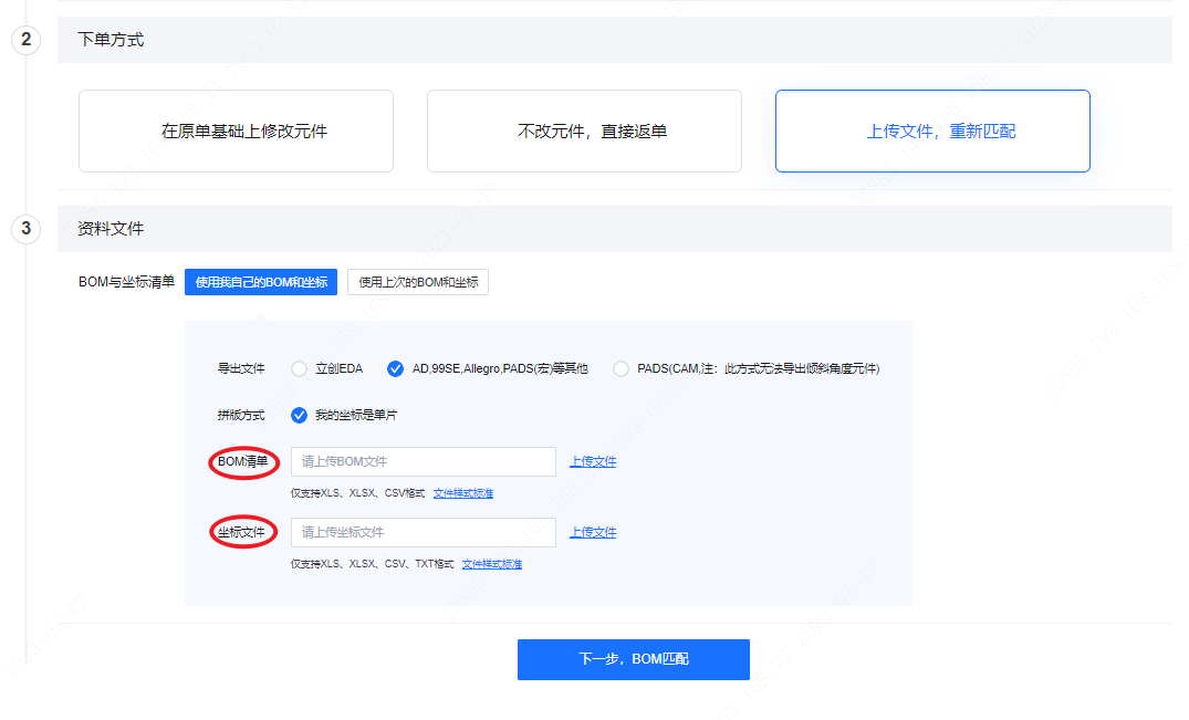 1.选此方式下单,您可以选择“使用自己的BOM和坐标”,重新上传BOM清单和坐标方式,再点击“下一步,BOM匹配”。