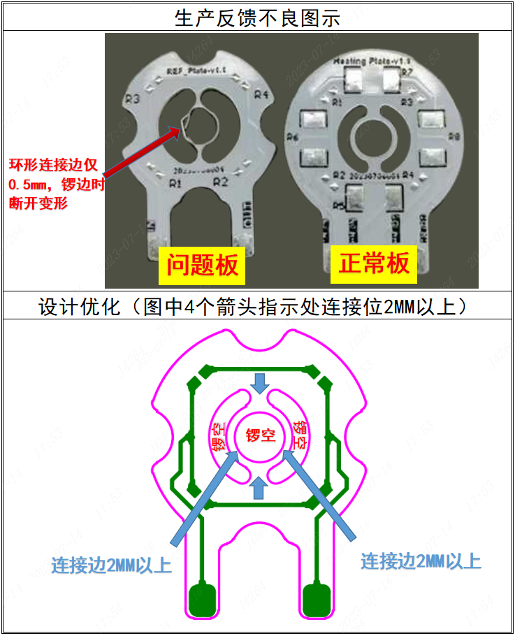 在生产锣板中,对于两边锣空位,中间很窄的连接边易锣形或断板的,至少需要2MM以上的连接位才能保证连接上不断开的(若板的尺寸很大,此连接边也需要相应的加宽)。
