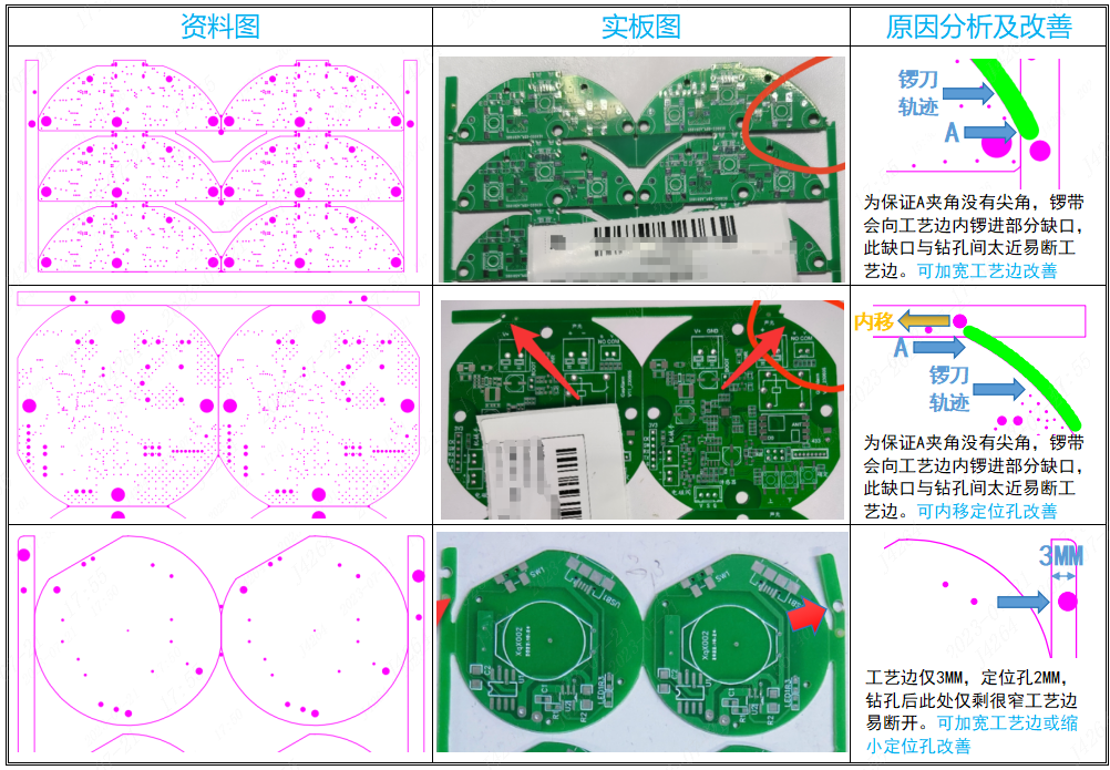 我们先分析常见的几种工艺边与定位孔不协调导致的工艺边断开情况(光点的位置同样请考虑好):