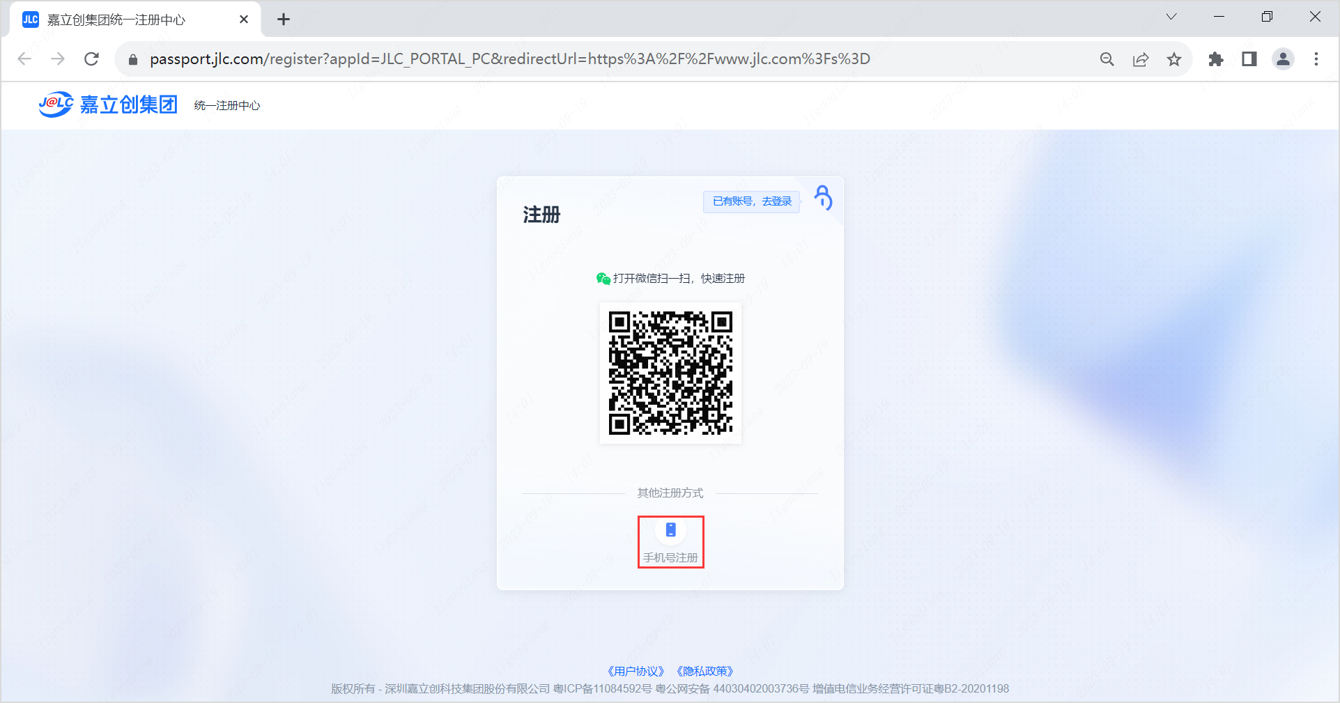 步骤 2:在统一注册中心页面, “ 其他注册方式 ” 点击 “ 手机号注册 ”;