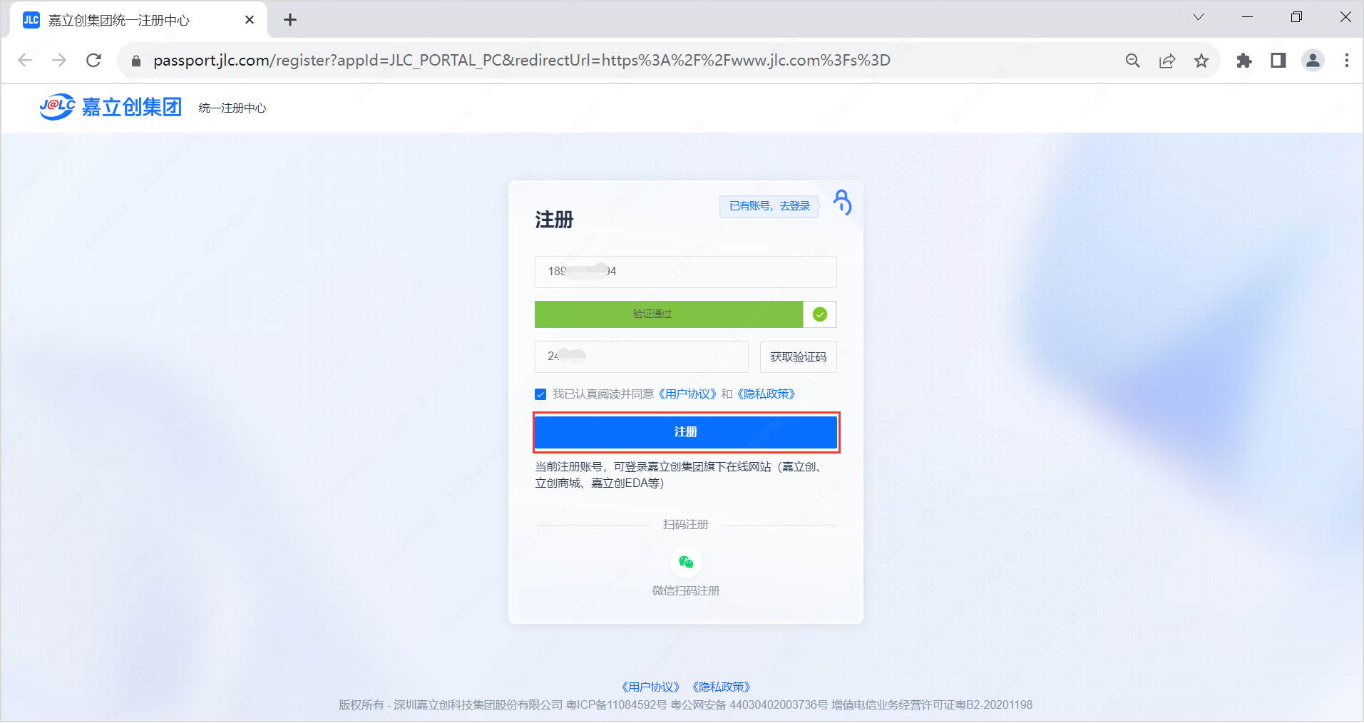 步骤 3:在统一注册中心,手机号注册页面,请先阅读《用户协议》和《隐私政策》,同意后,进行注册手机号输入,获取验证码,并完善输入有效验证码,最后点击 “ 注册 ” 按钮。