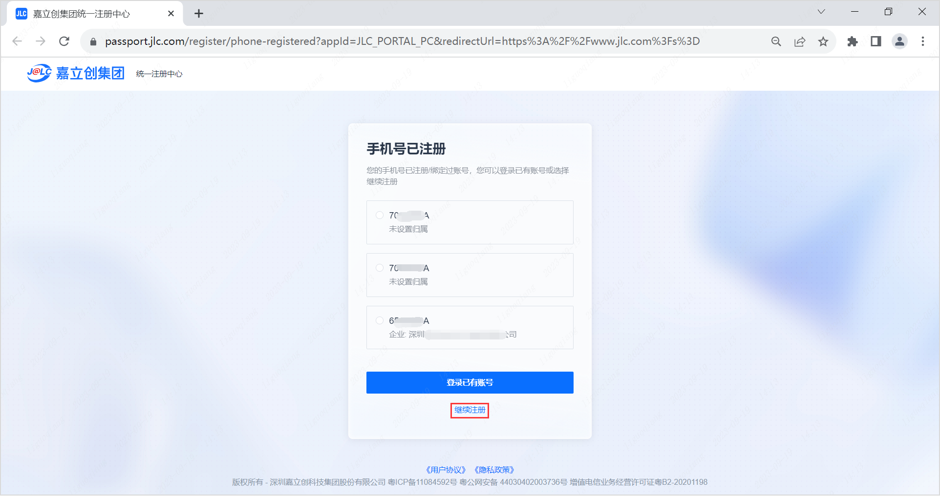 如果您的手机号已注册申请过账号,会将已注册的账号罗列显示,此时可以点击 “ 继续注册 ” 按钮,进行新账号申请;若您的手机号未注册过账号,则会直接提示注册成功。