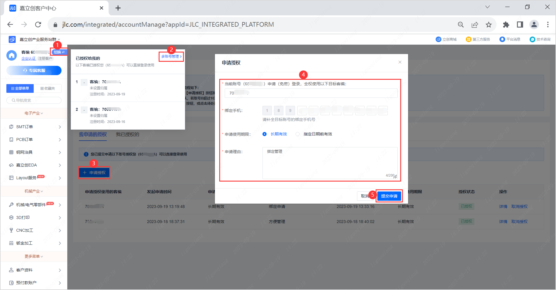 (2)在 “ 多账号管理 ” 页面,点击 “ 申请授权 ”,填充要绑定的申请账号,完善手机号码信息,确定使用期限,补充申请理由,最后提交申请,等待审核。