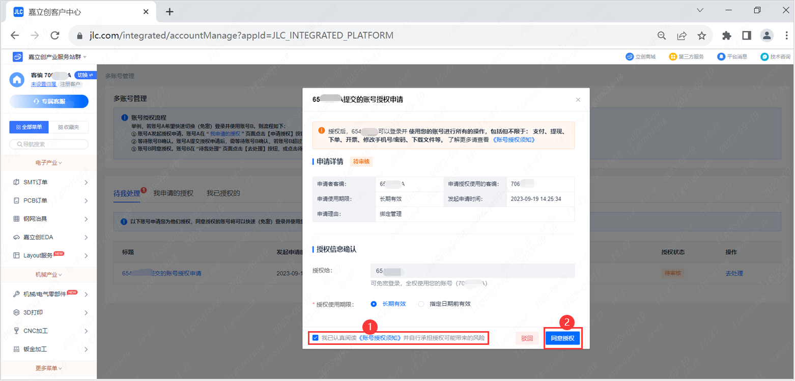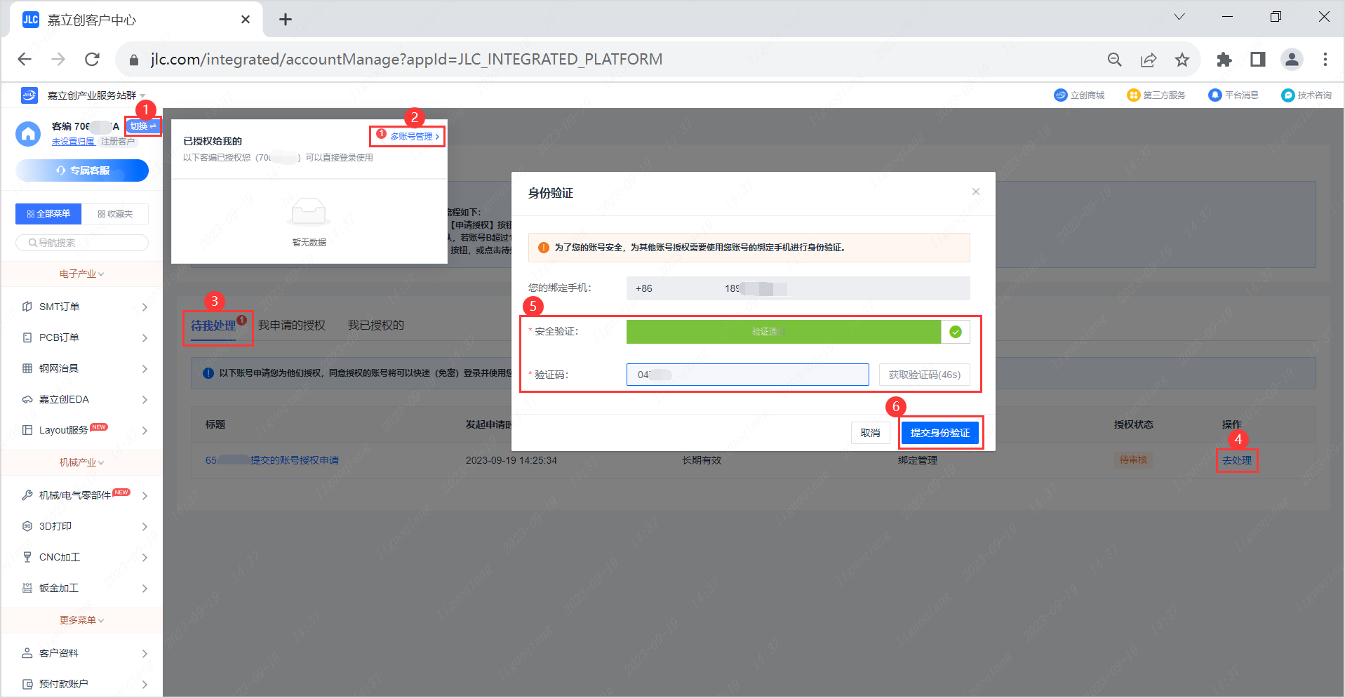登录被申请授权的账号,进入“ 多账号管理 ” 页面,在 “ 待我处理 ” 中查看授权申请,点击 “ 去处理 ”,进行身份验证,核对申请信息,进行审核处理。