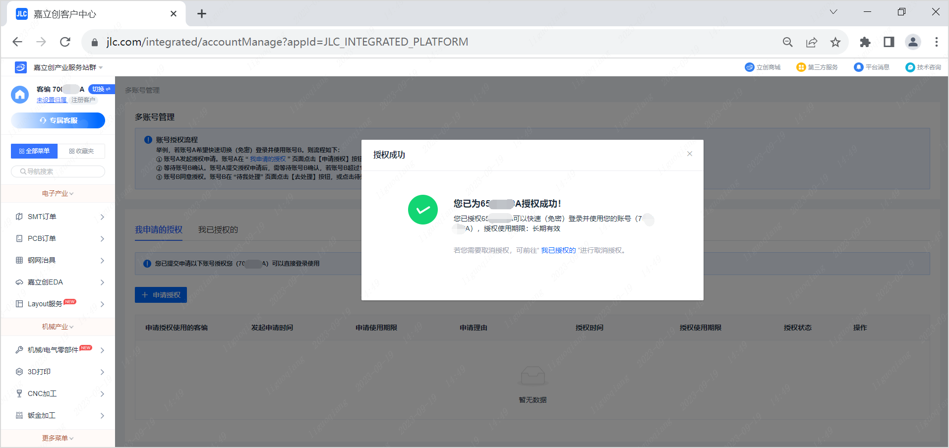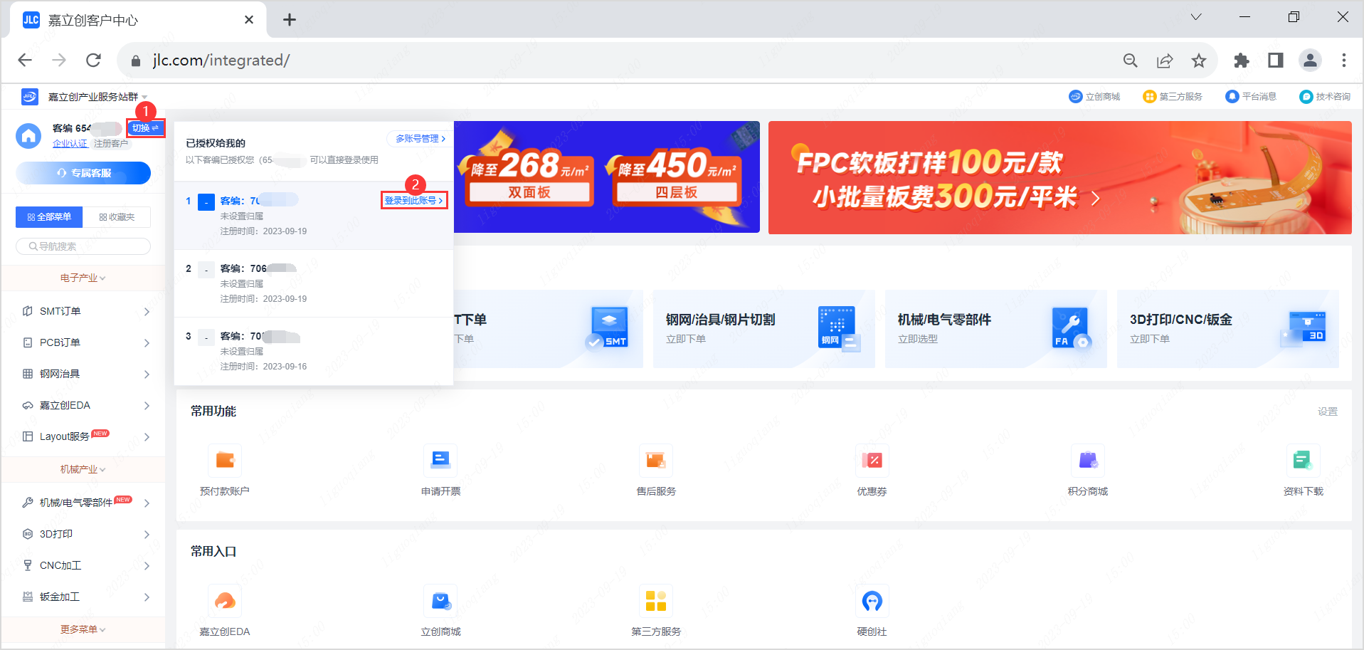 登录到客户中心,在界面左上角位置,客编后面 “ 切换 ” 按钮, 鼠标移到 “ 切换 ” 按钮上,会以小卡片的形式显示关联的账号,若还未有授权账号,则无数据显示;