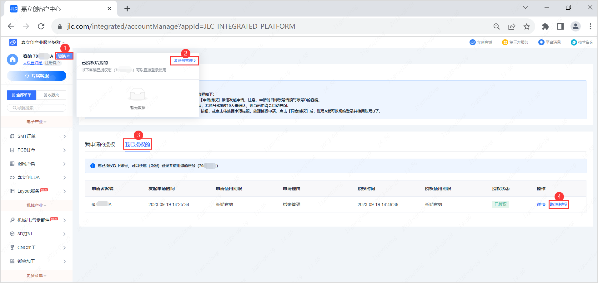 进入 “ 多账号管理 ” 页面,在 “ 我已授权的 ” 一栏,可点击 “ 取消授权 ” ,即可对已授权的账号,实现授权收回。