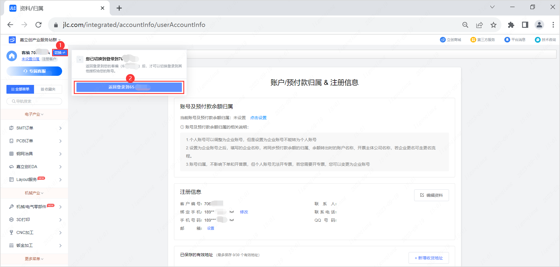 (1)客户中心,将鼠标移动到 “ 切换 ” 按钮上,在显示出的小卡片上面,点击 “ 多账号管理 ”,进入页面;