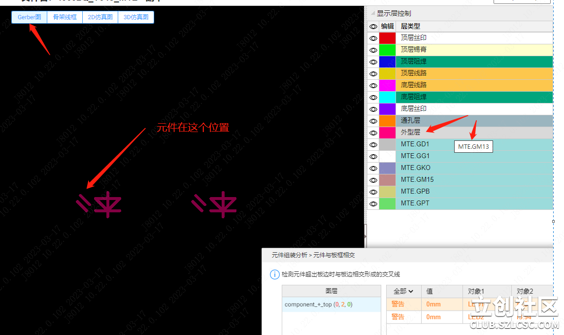 我们切换到Gerber视图位置,我们发现外型层取的是 GM13 层,(板子实际正确的外型层在GKO层,我们遵守的规范是 终极标准:某D系列软件外形层及非金属化孔及槽的标准及规范 //www..com/portal/t6i10153.html),这个位置刚好画得有线条,被当成线框,如果与元件相接触就发生误报。