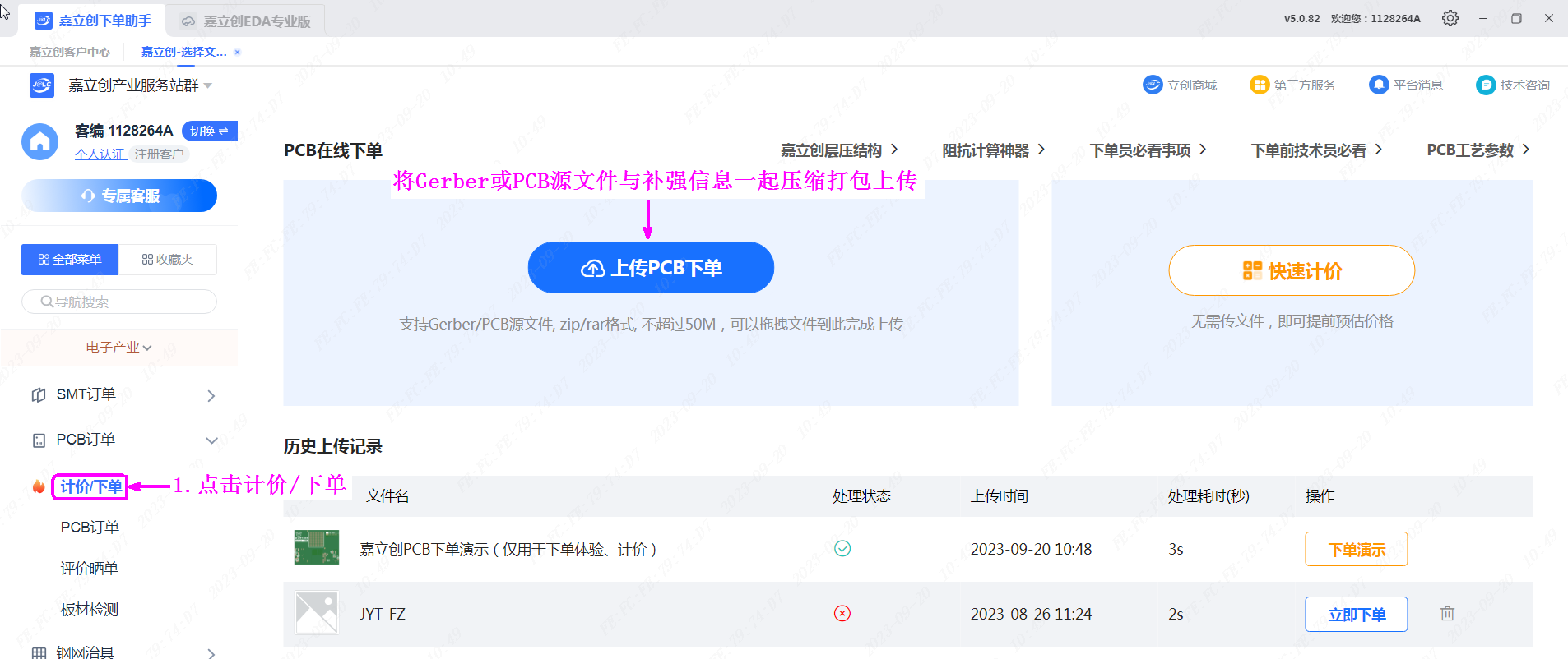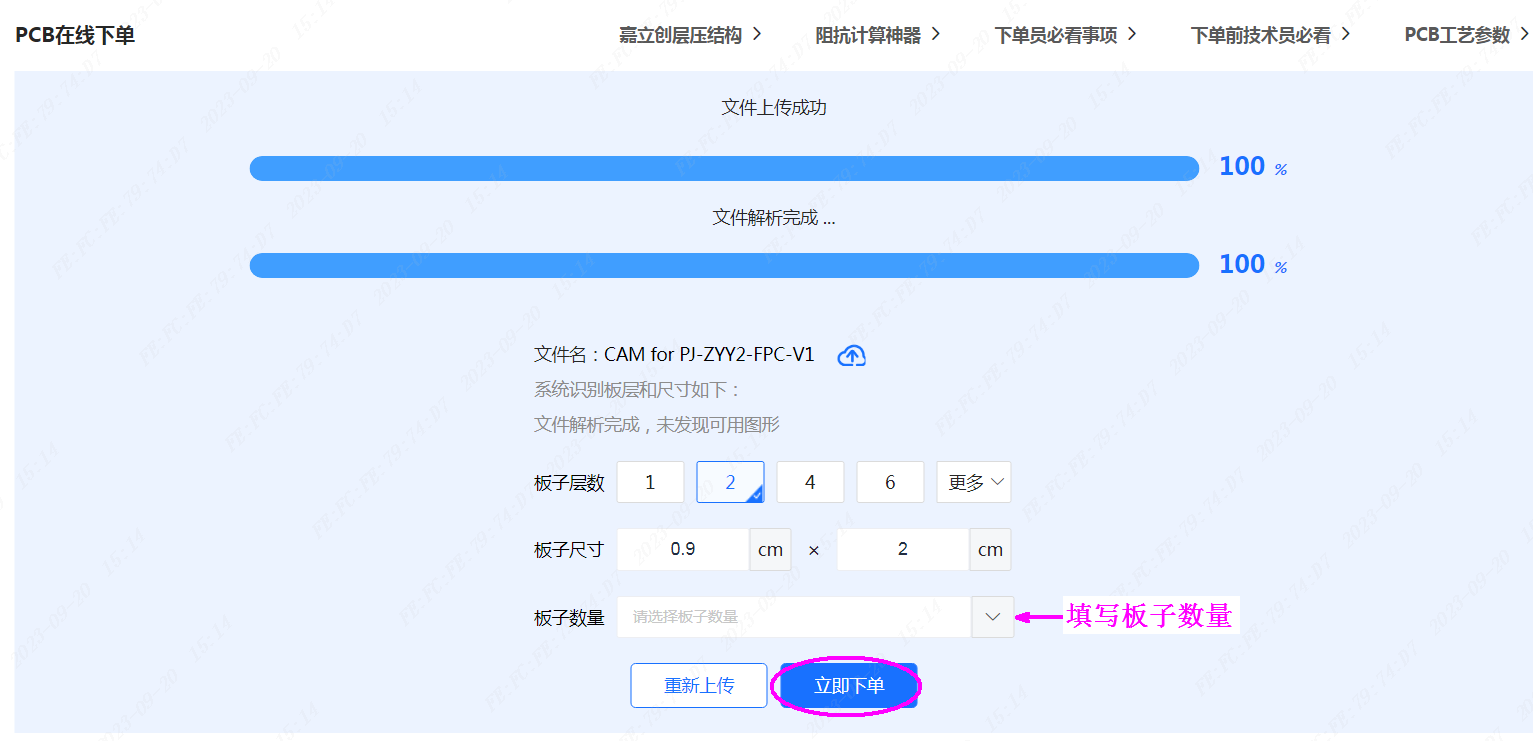 3.上传文件后,等待文件解析,确认板层,板尺寸填写板子数量,再点立即下单(个别资料解析失败,可以手动填板层,板尺寸继续下单)