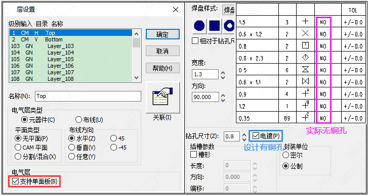 1)在"设置"-"层设置"中勾选了"支持单面板",导致设计的所有有铜孔输出后变成无铜孔,引起开路