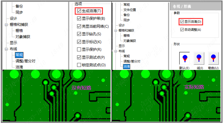 2)在"工具"-"选项"中,如果选择了"生成泪滴",一定要填充(Hatch)恢复铺铜,然后打开"显示泪滴"检查,避免有短路的情况