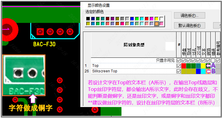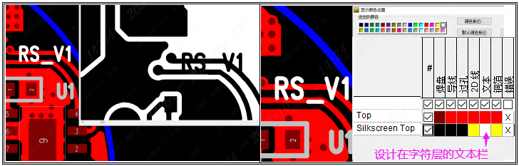 5)把标识符号错误设计在Top/Bottom的线路层,这样输出后就会与线路重合从而短路,正确的是设计在对应的silkscreen字符层文本栏
