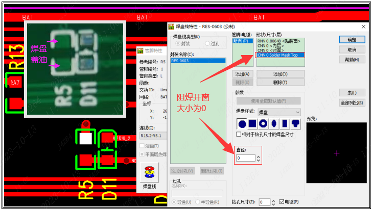 1)在"焊盘特性"-中增加的Solder Mask Top中把阻焊大小设为0,导致没有阻焊开窗,从而焊盘盖油。