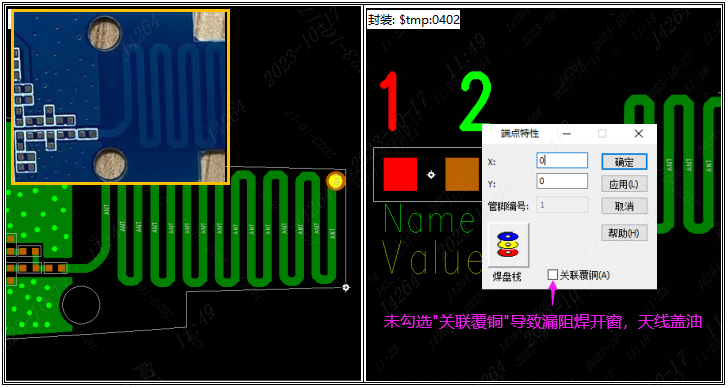 勾选“关联覆铜”,这样输出来的阻焊才会开窗的,从而让天线露铜上锡/沉金。