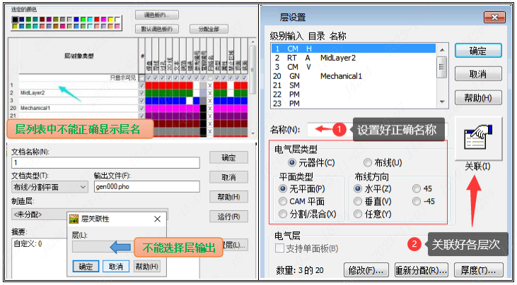 好各层的名称和类型,同时一定要把顶底层对应的线路阻焊字符等层次关联好(未关联会导致输出GERBER漏图案)