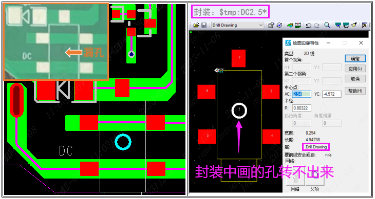 3)设计在"封装"中的线圈孔不能输出GERBER,请在PCB文件中画好:建议用焊盘孔或是2D画线圈在Drill Drawing层