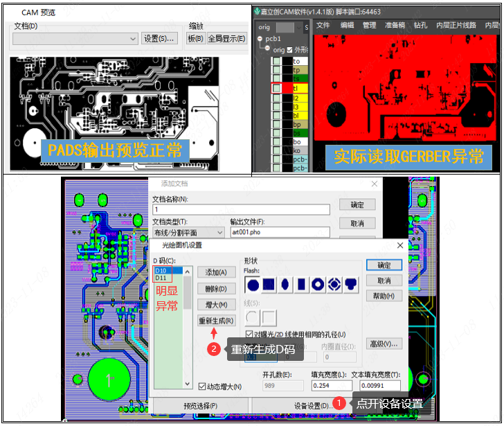 3)在CAM输出时预览文件是正常的,实际上输出的GERBER文件出现乱码异常(如图中仅2个D码明显异常),导致图形错误。